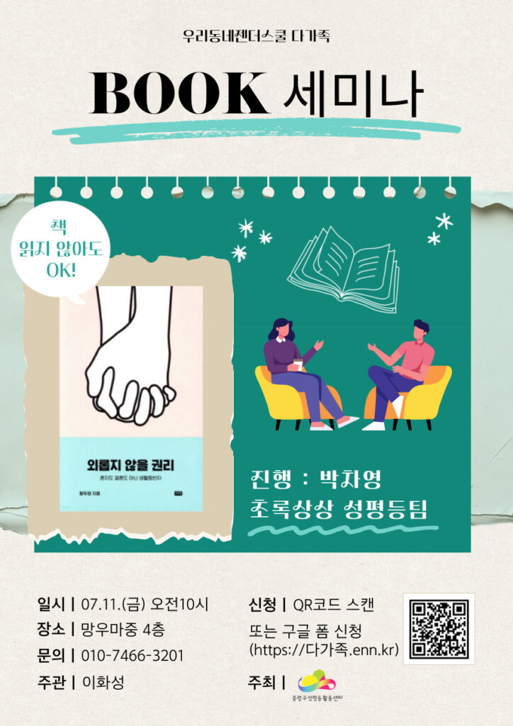 3주차에는 황두영 저자의 책 『외롭지 않을 권리』를 함께 읽고 북세미나를 진행했습니다. 이 책은 1인 가구, 비혼, 비혈연 공동체 등 이른바 ‘비정형 가족’들이 만들어가는 일상의 돌봄, 그리고 이들이 마주한 제도적 한계를 구체적으로 조명하며, ‘혼자이지만 외롭지 않을 권리’를 함께 고민하게 만듭니다. 참여자들은 각자의 경험을 나누며 새로운 관계와 연대의 가능성을 모색해보았습니다.