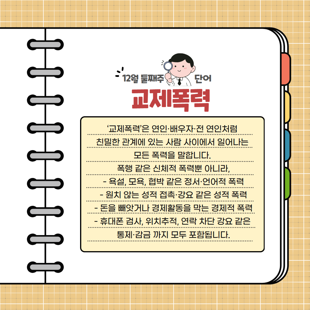 ‘교제폭력’은 연인·배우자·전 연인처럼 친밀한 관계에 있는 사람 사이에서 일어나는 모든 폭력을 말합니다. 따귀나 폭행 같은 신체적 폭력뿐 아니라,