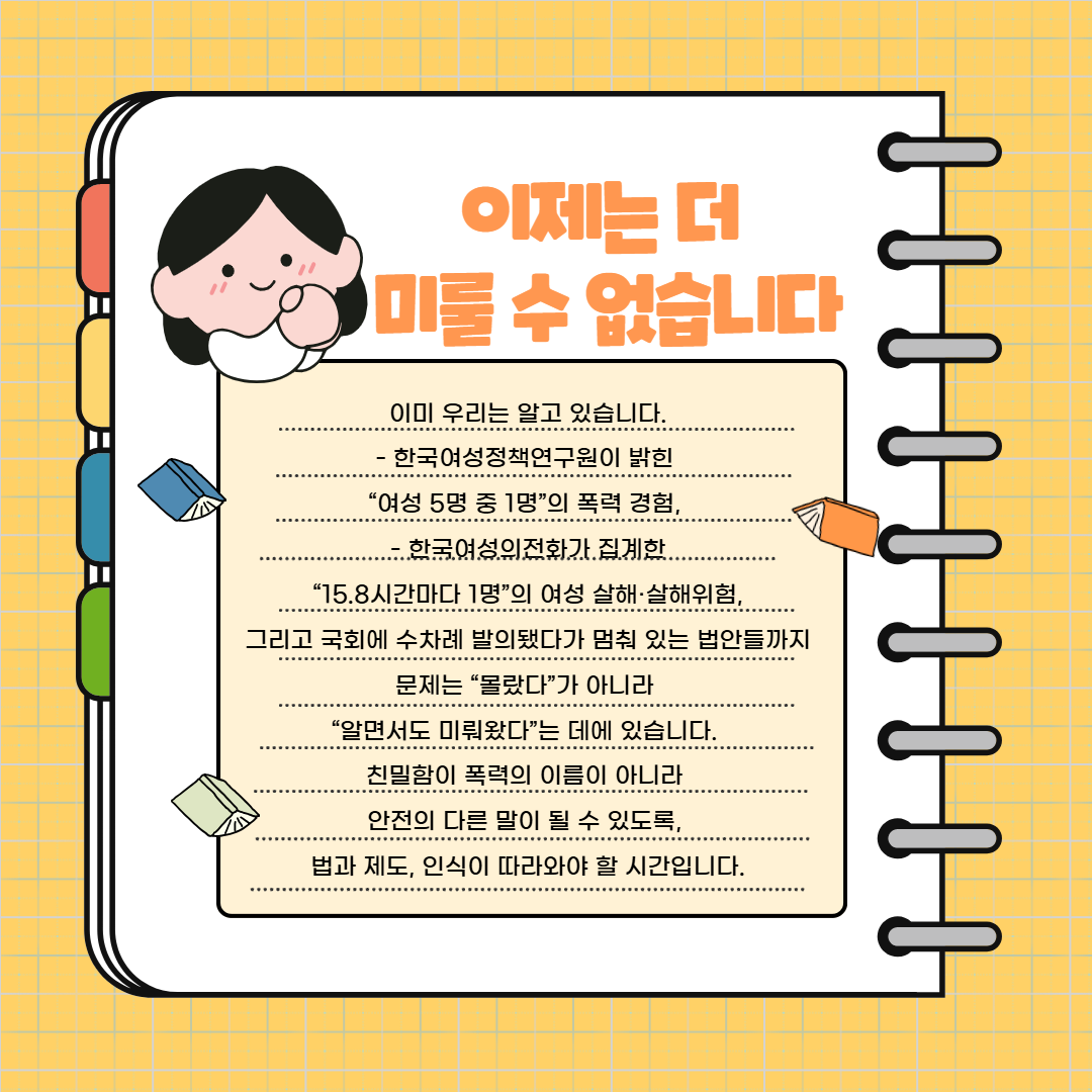 문제는 “몰랐다”가 아니라 “알면서도 미뤄왔다”는 데에 있습니다. 친밀함이 폭력의 이름이 아니라 안전의 다른 말이 될 수 있도록, 법과 제도, 인식이 따라와야 할 시간입니다.