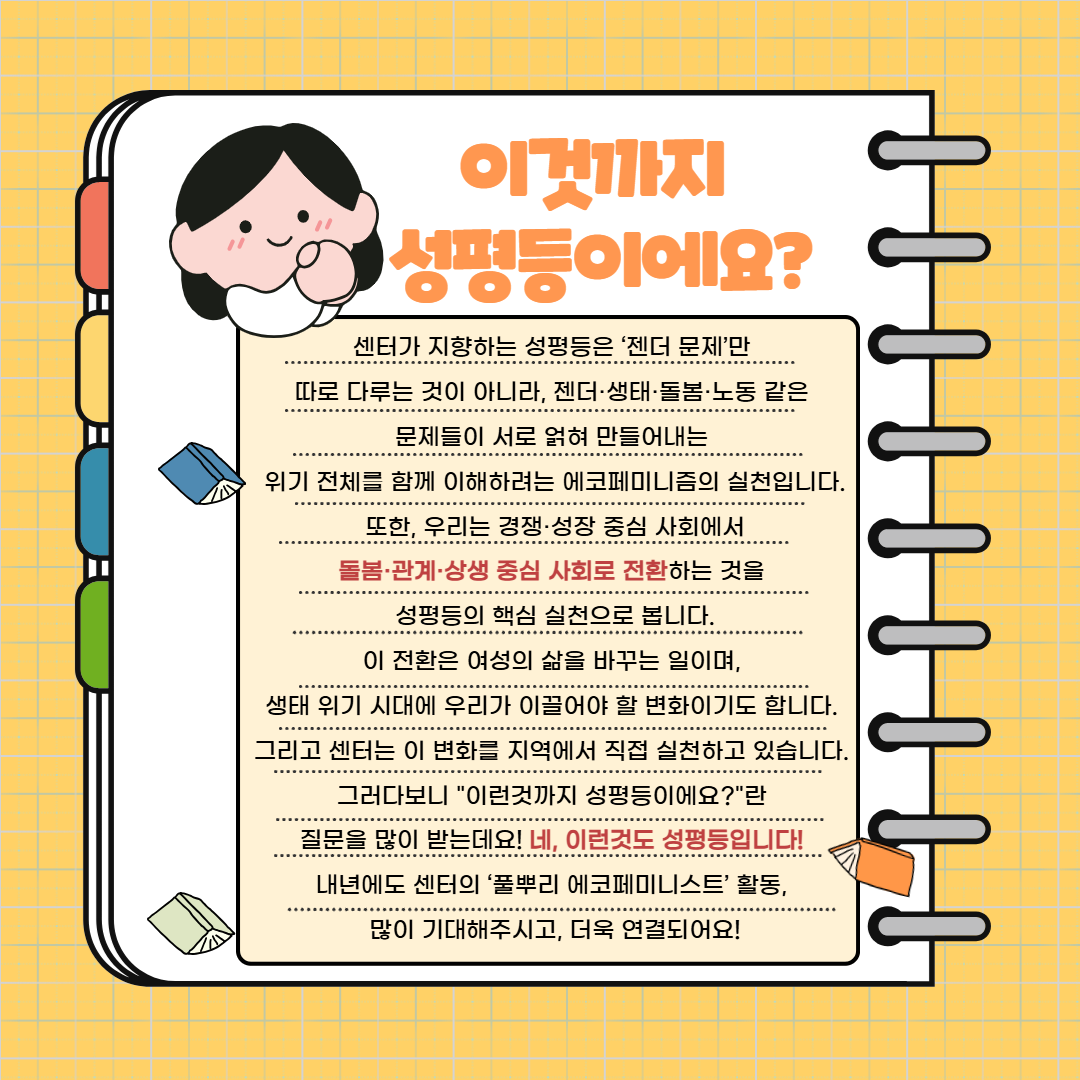 에코페미니즘은 단순히 ‘환경을 보호하자’는 제안이 아닙니다. 근대적 질서—지배, 정복, 효율성, 성장 중심의 논리—를 넘어서 관계성, 상호의존성, 돌봄, 연대의 가치로 새로운 세계를 상상하는 시도예요. 생명을 서로 단절된 개체가 아니라 서로 영향을 미치고 책임을 나누는 존재들로 보게 합니다.이 관점은 성별, 종, 계급, 지역을 넘어 더 넓은 공생의 정치를 열어줍니다.내년에도 센터의 ‘풀뿌리 에코페미니스트’ 활동, 많이 기대해주시고, 더욱 연결되어요!