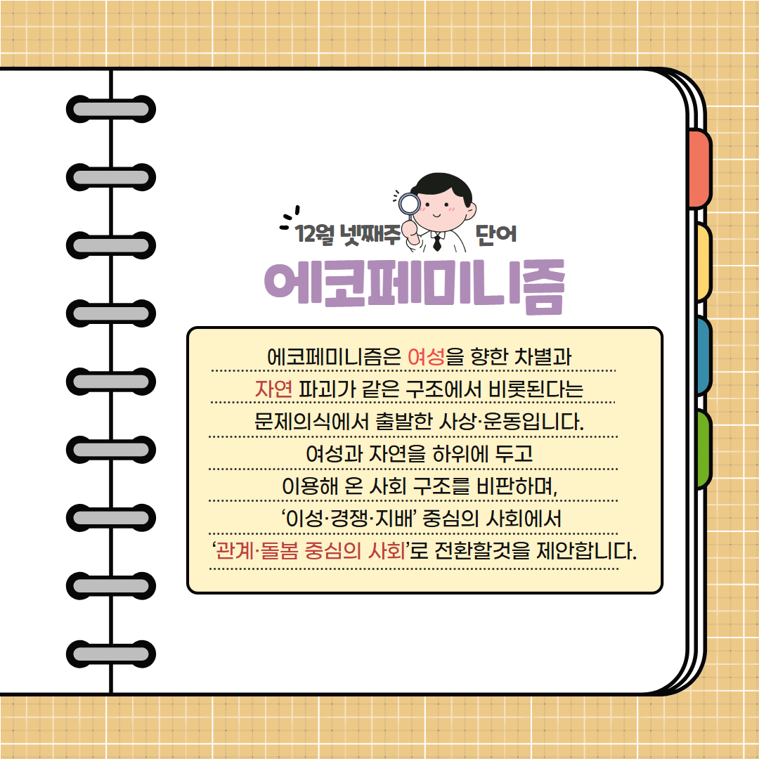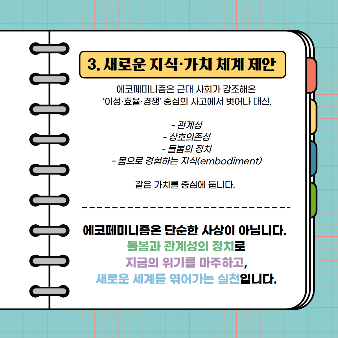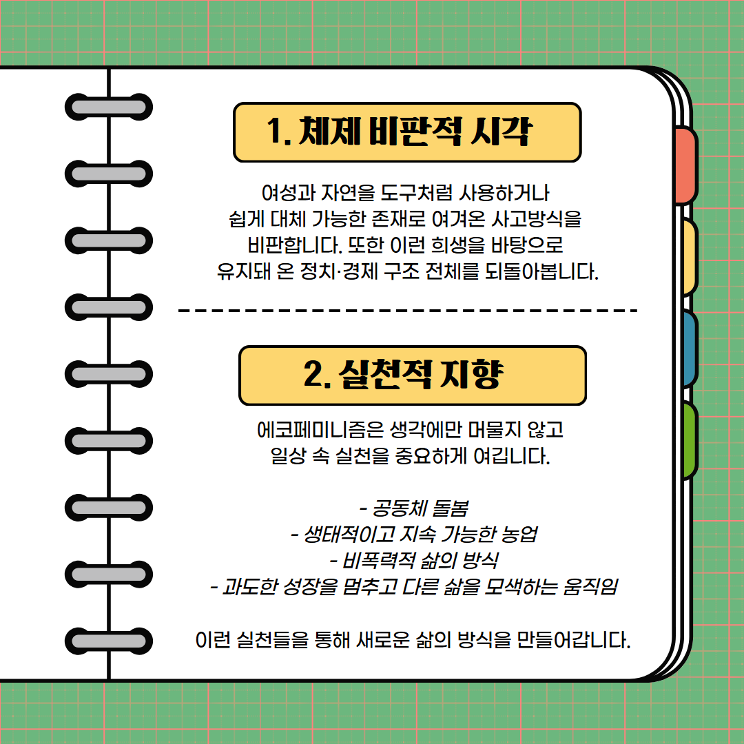 에코페미니즘은 근대 사회가 강조해온 ‘이성·효율·경쟁’ 중심의 사고에서 벗어나, 대신