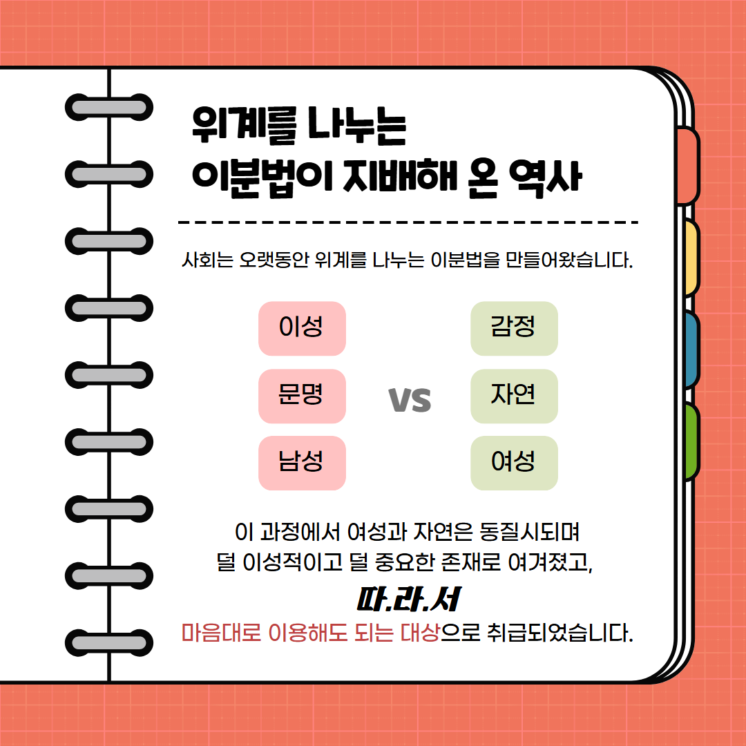 역사적으로 사회는 ‘이성/감정’, ‘문화/자연’, ‘남성/여성’처럼 위계를 나누는 이분법을 만들어 왔습니다. 이 과정에서 여성은 자연·감정과 연결되며 ‘덜 이성적이고 덜 중요한 존재’로 여겨졌고, 자연 역시 ‘어머니 자연’ 등으로 여성화되어 인간이 마음대로 이용해도 되는 대상으로 취급되었습니다. 이처럼 여성과 자연을 하위적 존재로 보는 시선은 단순한 생각에 그치지 않고 사회 전반의 규칙과 제도 속에 자리 잡게 되었습니다.