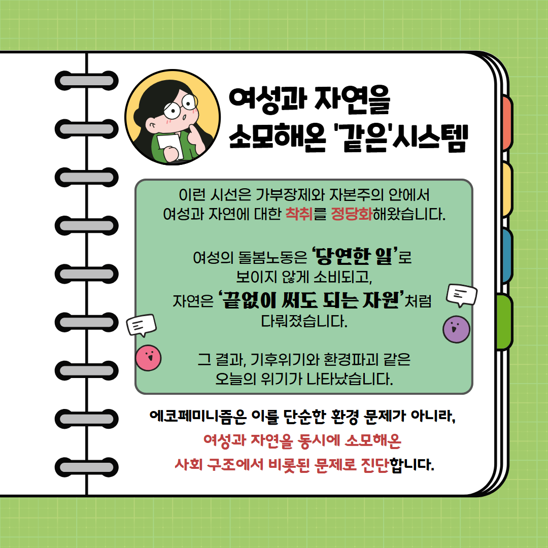 이러한 관점은 결국 가부장제와 자본주의 체계 안에서 여성과 자연에 대한 지속적인 착취를 정당화해왔는데요.