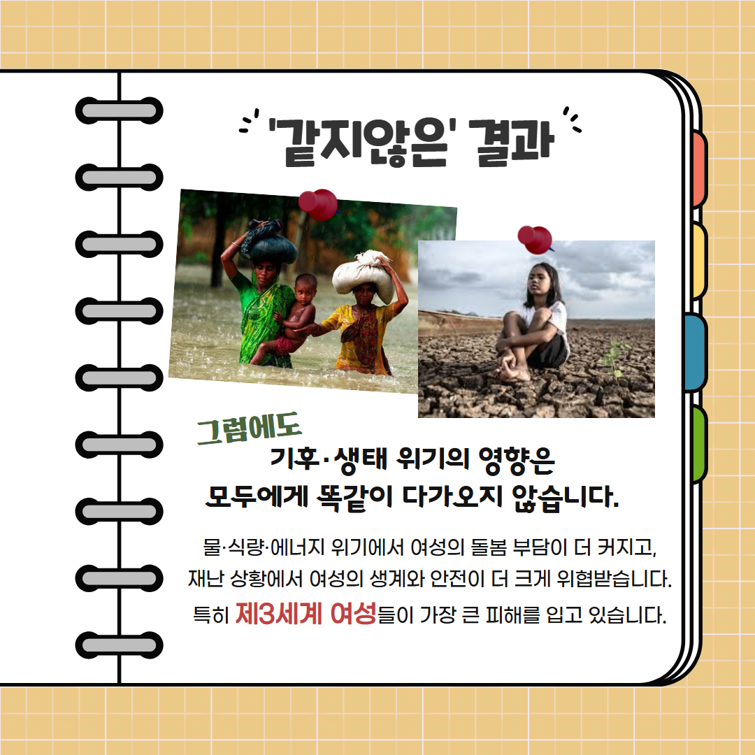 - 홍수·가뭄·폭염 같은 재난에서 여성의 생계·안전·건강이 더 위협받고