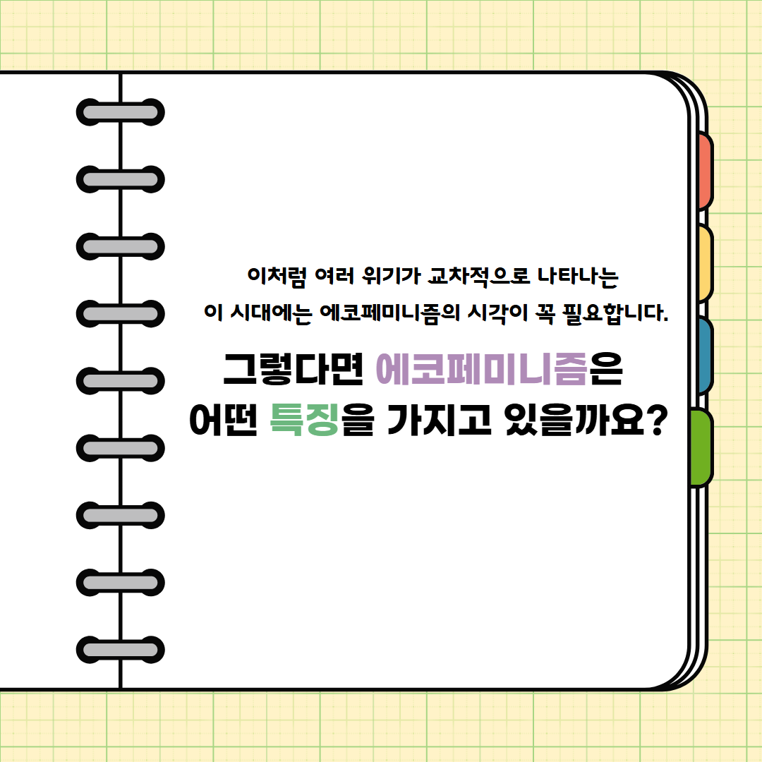 지금처럼 여러 위기가 한꺼번에 나타나는 시대에는 여성과 자연을 함께 보려는 에코페미니즘의 시각이 꼭 필요합니다. 그렇다면 이와 같은 에코페미니즘은 어떤 특징을 가지고 있을까요?