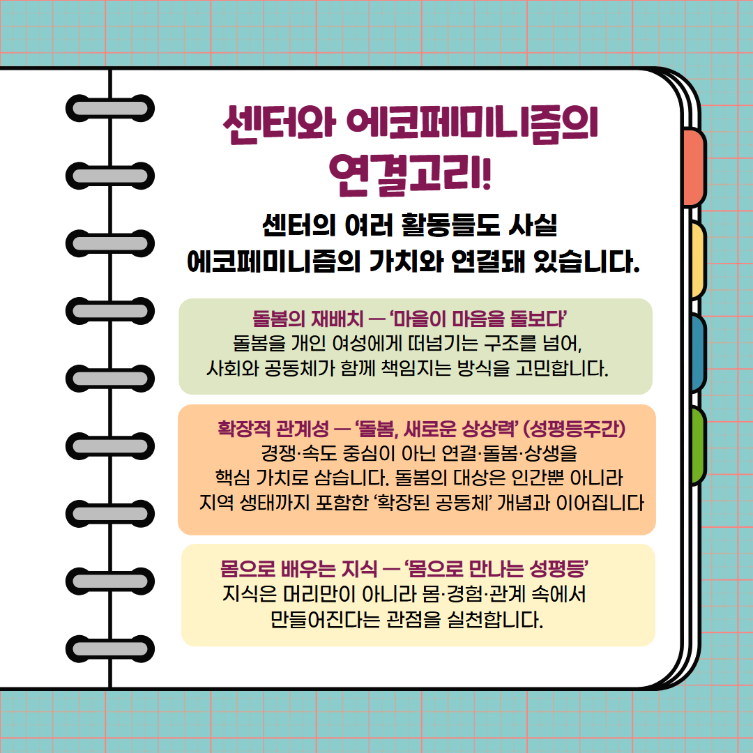 센터의 여러 활동들도 사실 에코페미니즘의 가치와 깊이 연결되어 있습니다.