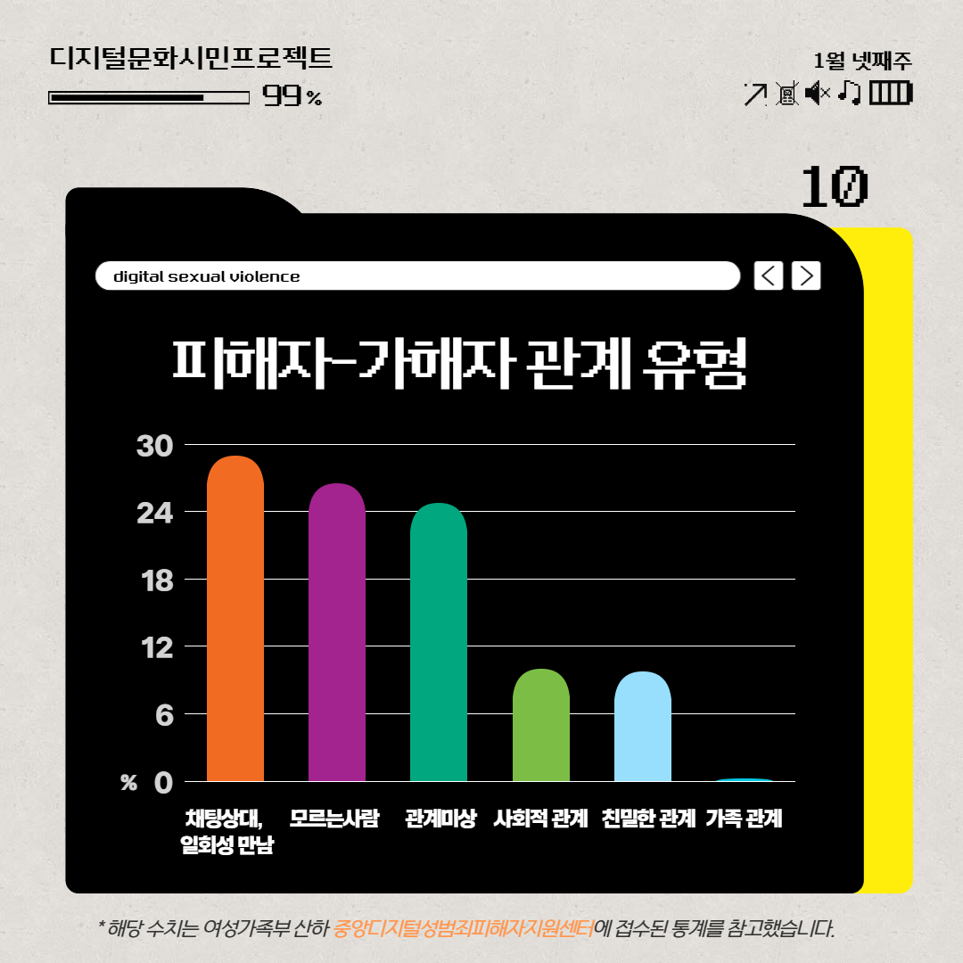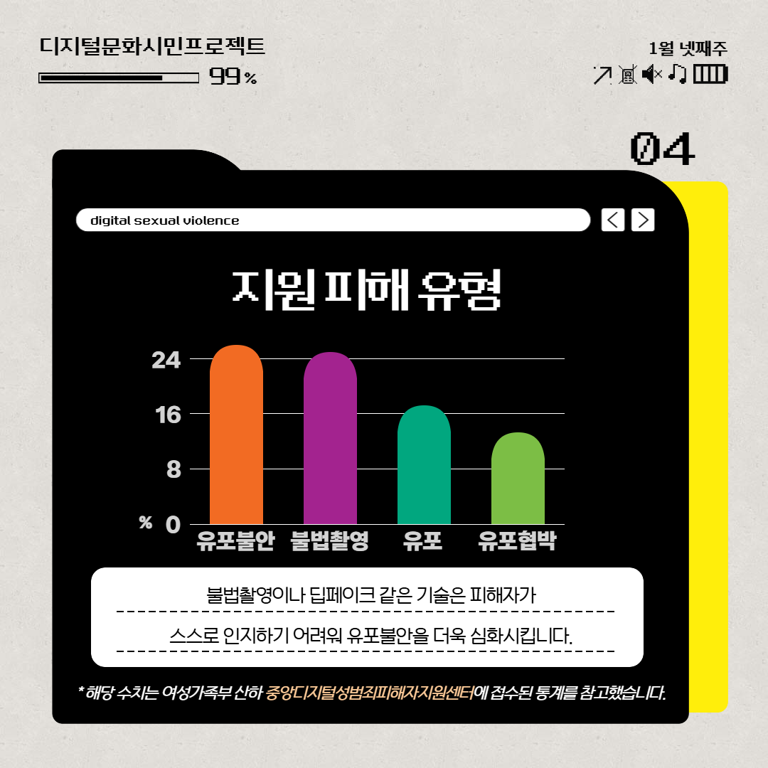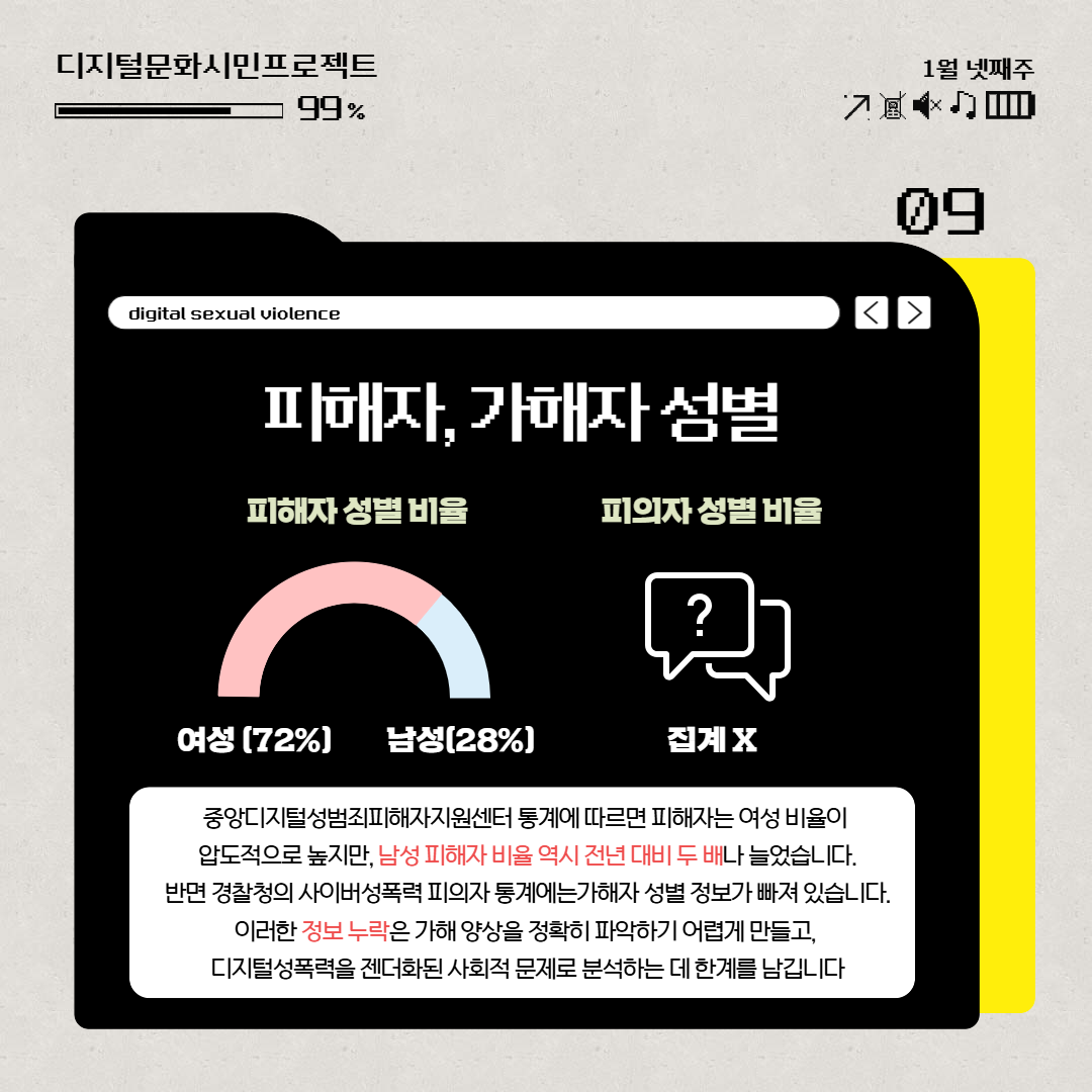 2024년 중앙디지털성범죄피해자지원센터 통계에 따르면 디지털성폭력 피해자는 여성 비율이 압도적으로 높지만,