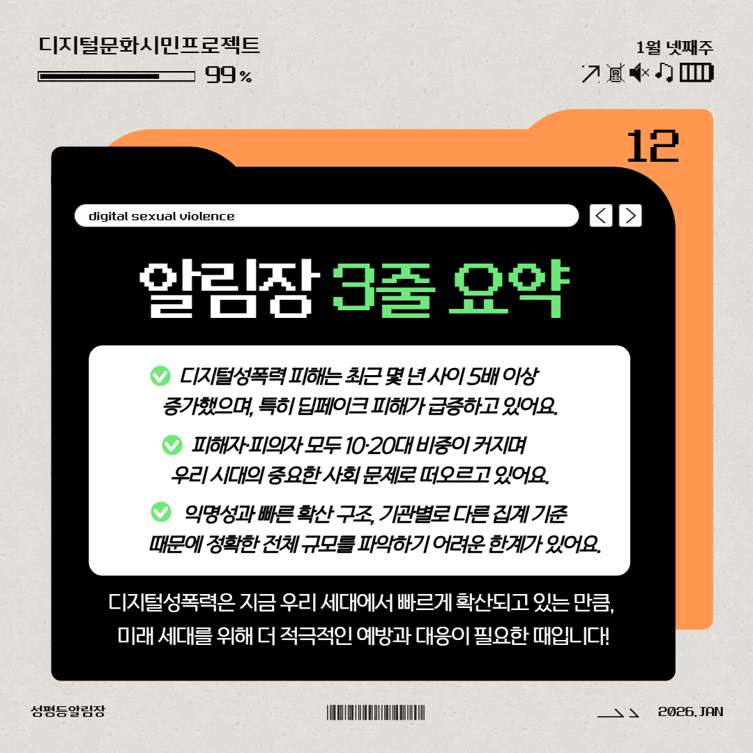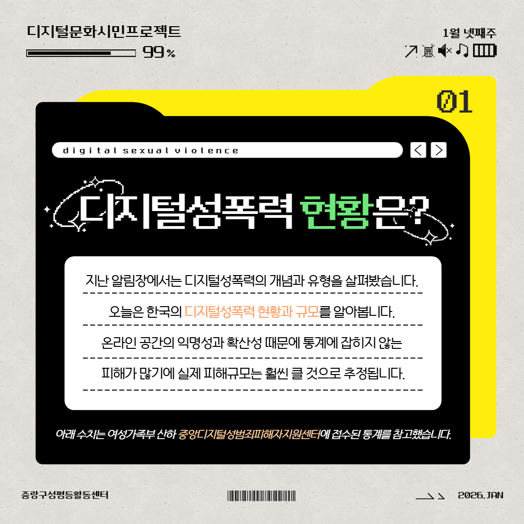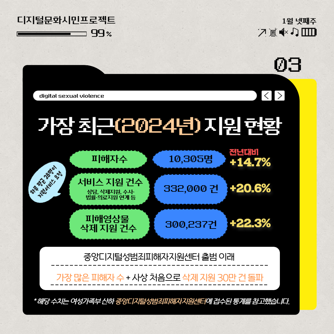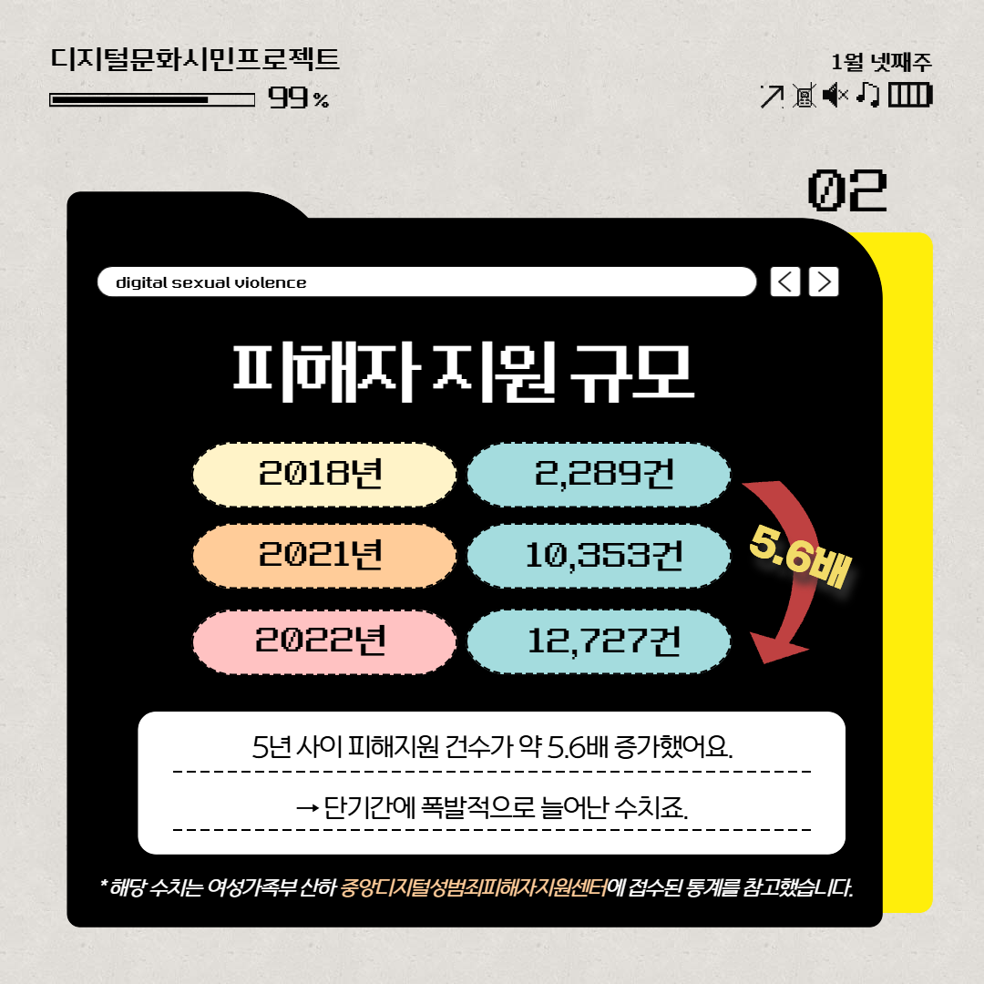 카드 1. 디지털성폭력 현황지난 알림장에서는 디지털성폭력의 의미와 유형을 알아봤어요. 오늘은 한국에서 디지털성폭력의 현황과 규모를 살펴봅니다. 디지털성폭력은 익명 공간에서 빠르게 퍼지는 특성상 통계에 잡히지 않는 피해가 훨씬 많습니다. 또 신고, 지원 기관이 분산되어 있어 하나의 통합된 지표를 만들기도 어렵습니다. 따라서 아래에 나오는 수치들은 여성가족부 산하 ‘중앙디지털성범죄피해자지원센터’에 접수된 일부 사례일 뿐이며, 실제 발생 규모는 이보다 훨씬 클 것으로 추정됩니다.