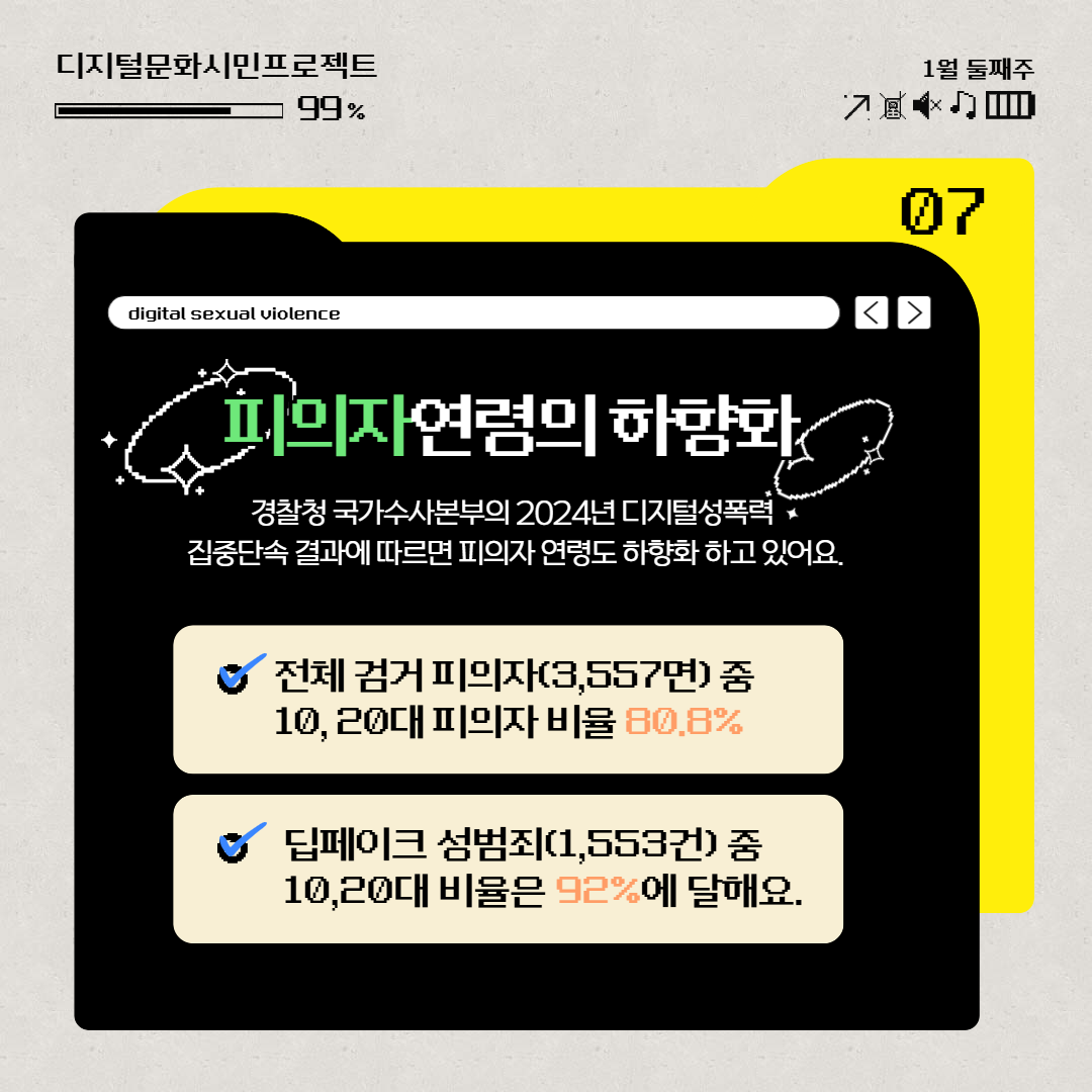 - 딥페이크(합성·편집) 피해의 경우, 10대·20대 비중이 92.6%로 압도적입니다.