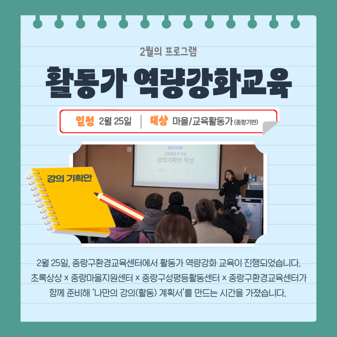 2월 25일, 중랑구환경교육센터에서 활동가 역량강화 교육이 진행되었습니다. 초록상상 × 중랑마을지원센터 × 중랑구성평등활동센터 × 중랑구환경교육센터가 함께 준비해 ‘나만의 강의(활동) 계획서’를 만드는 시간을 가졌습니다.