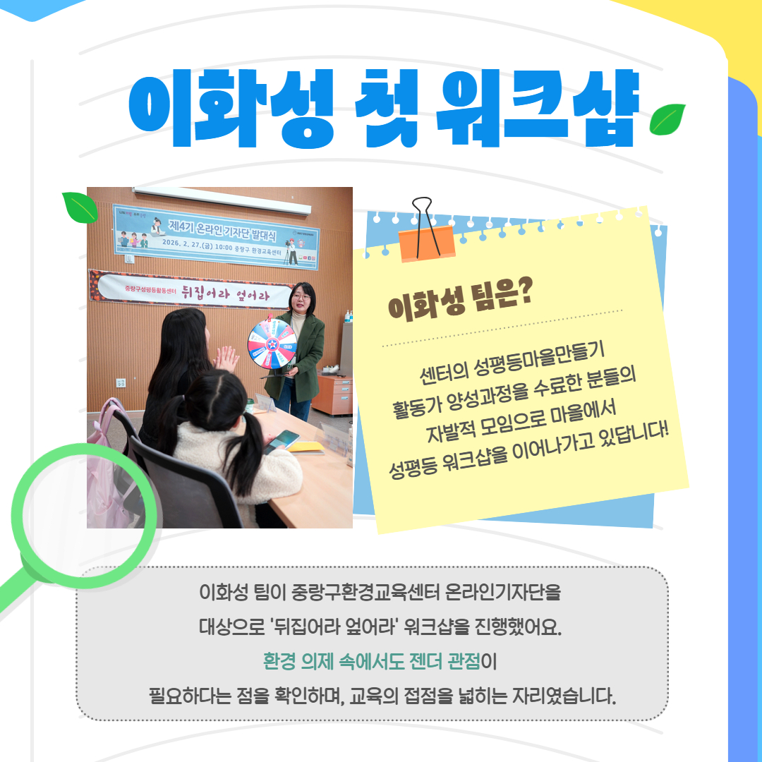 이화성 팀이 중랑구환경교육센터 온라인기자단을 대상으로 '뒤집어라 엎어라' 워크샵을 진행했어요. 환경 의제 속에서도 젠더 관점이 필요하다는 점을 확인하며, 교육의 접점을 넓히는 자리였습니다.