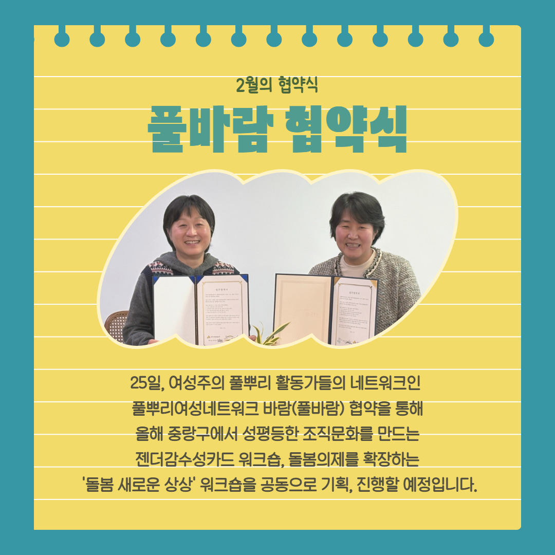 25일, 여성주의 풀뿌리 활동가들의 네트워크인 풀뿌리여성네트워크 바람(풀바람) 협약을 통해 올해 중랑구에서 성평등한 조직문화를 만드는 젠더감수성카드 워크숍, 돌봄의제를 확장하는 '돌봄 새로운 상상' 워크숍을 공동으로 기획, 진행할 예정입니다.
