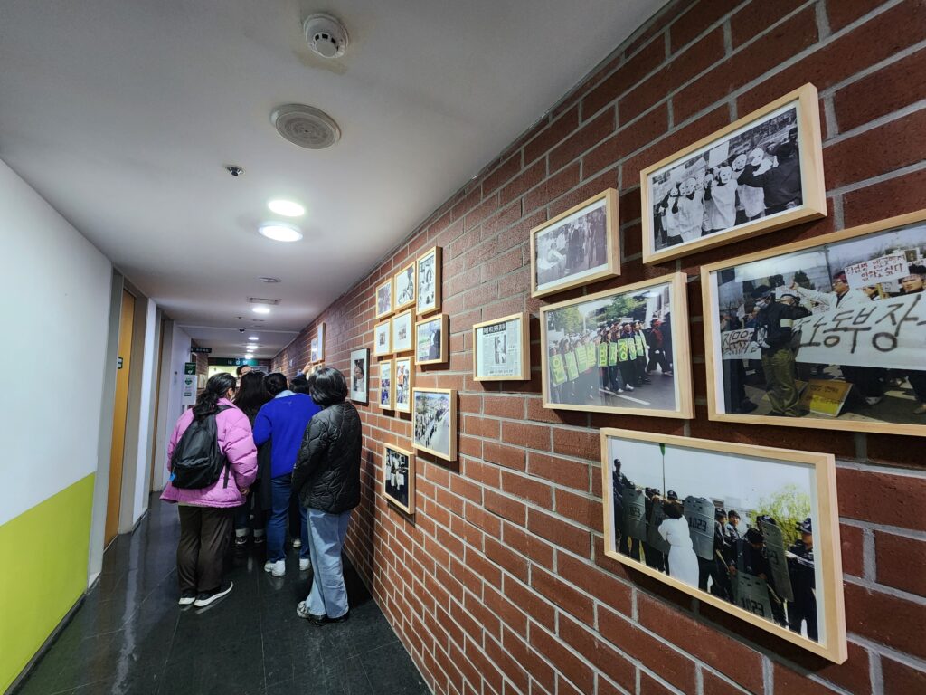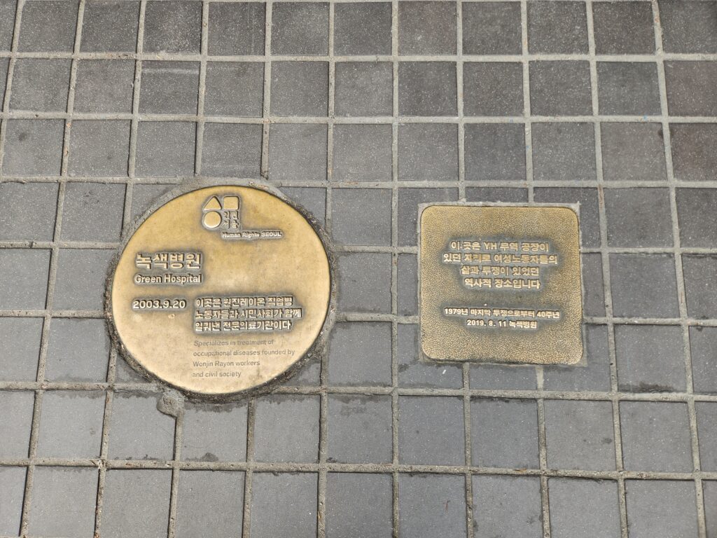 녹색병원은 김경숙 열사가 일했던 YH무역 공장이 사라지고 현재의 녹색병원이 되었습니다. 노동자를 존중하고 지역사회에 열려 있는 중랑구의 보물 같은 병원이기도 합니다. 녹색병원의 지하에 김경숙 열사 전시물과 YH무역 여성노동자들의 투쟁을 기리는 현판 등을 관람했습니다.