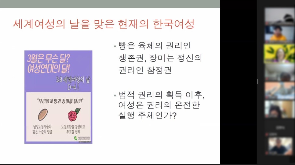 강의에 앞서 여성의 날의 기원과 이를 기리는 태도에 대해 이해하는 시간이 있었습니다.