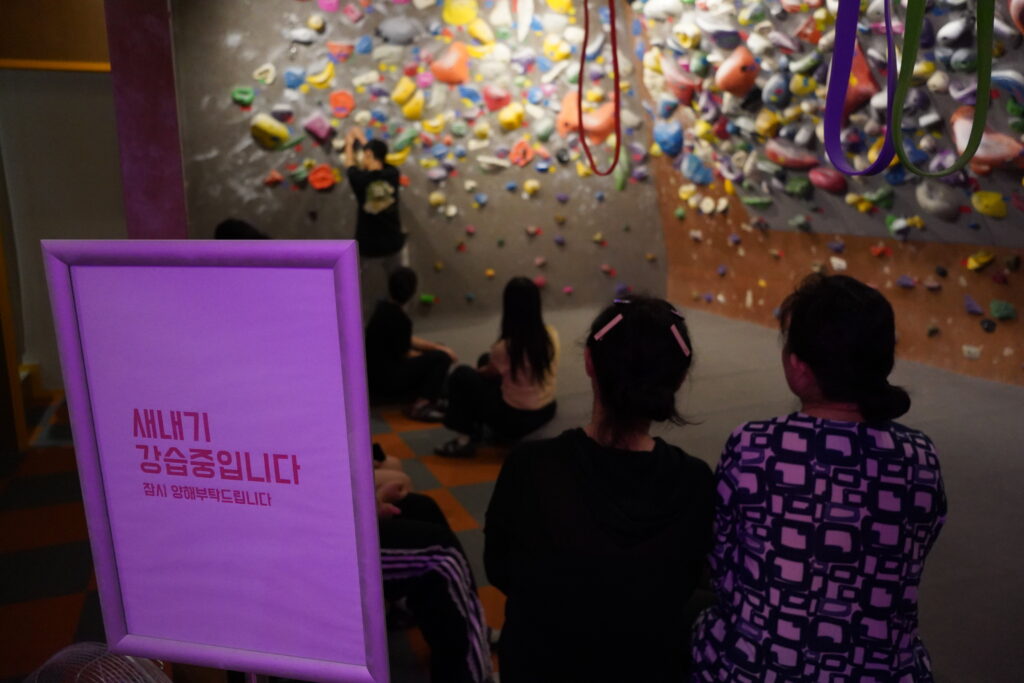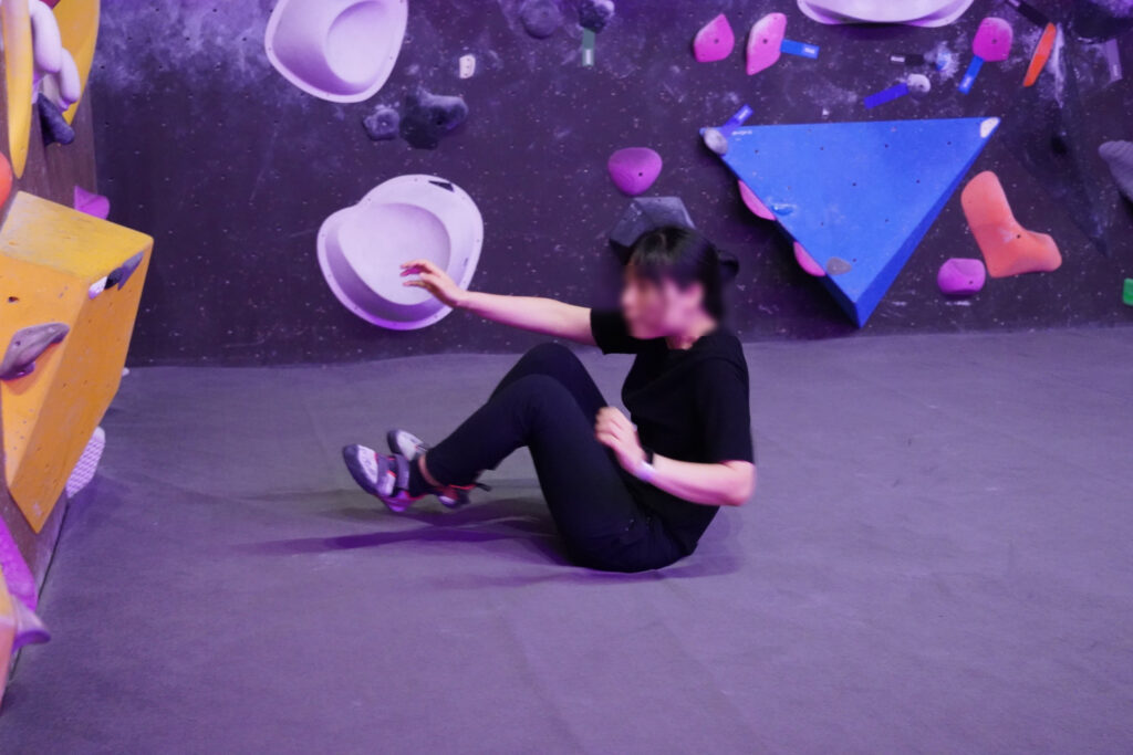 기본을 익히고 나니 이제는 본격적으로 벽을 오를 차례. 그런데 등반을 시작하기 전, 먼저 배운 것은 ‘떨어지는 법’이었습니다. 중심을 잃더라도 안전하게 착지할 수 있어야 하기 때문이죠. 강사님은 “차라리 과감하게 넘어지라”고 강조하시며, 손으로 바닥을 짚으면 오히려 다칠 수 있다고 알려주셨습니다. 대신 패드 위로 무게 중심을 뒤로 옮겨 엉덩이로 착지하는 것이 가장 안전한 방법이라 하셨고, 우리는 그 동작을 여러 번 반복하며 익혔습니다.