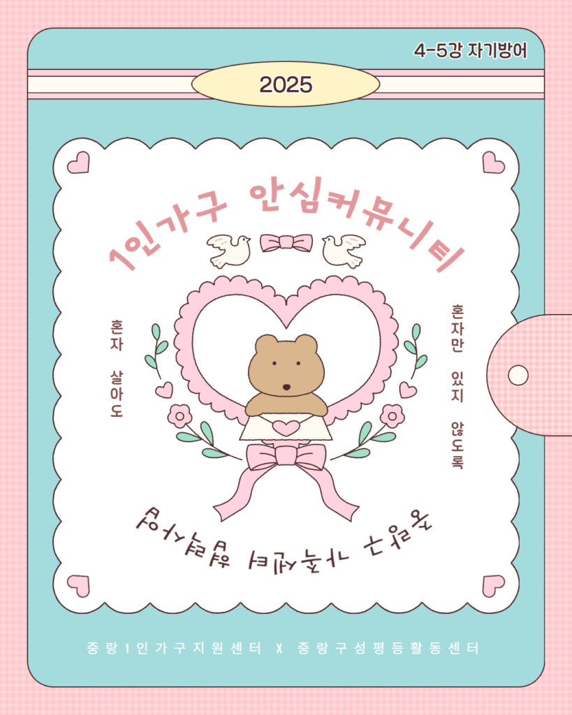 2024년에 이어 중랑구 가족센터와 함께 진행하는 1인가구 대상 프로젝트가 진행되고 있습니다. 총 5회차로 진행되는 1인가구 안심 커뮤니티 프로그램은 중랑구에 거주하는 1인가구 참여자들이 건강한 네트워크를 만들어 스스로를 돌보고 함께 돌보는 관계망 형성을 목표로 합니다. 자기돌봄을 위한 힐링요가, 클라이밍에 이어 9월4일, 11일 2회에 걸쳐 자기방어훈련이 진행되었습니다.