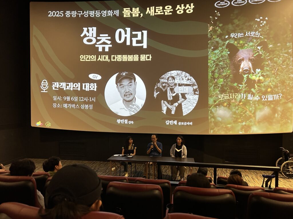 상영 후에는 왕민철 감독님과 곰보금자리 김민재 활동가가 무대에 올라 관객들과 대화를 이어갔습니다. 질문과 답변은 영화가 던진 ‘다종돌봄’ 메시지를 더 깊게 확장시켜 주었습니다.