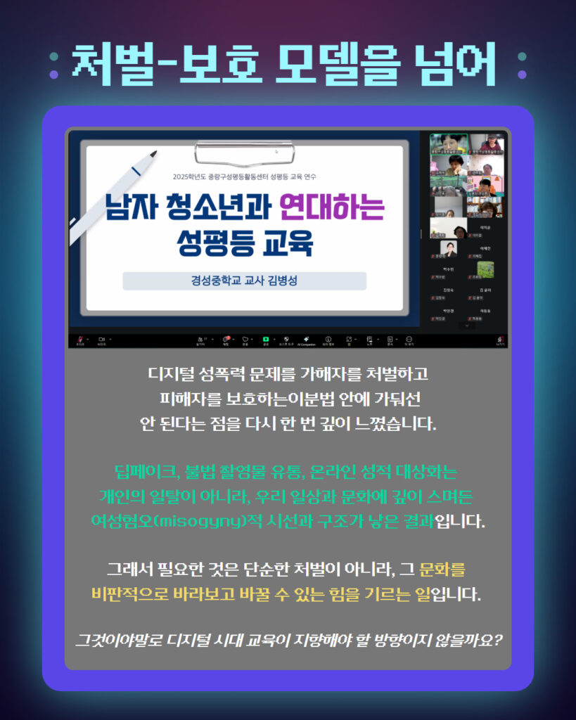 그래서 필요한 건 처벌과 보호뿐만이 아니라, 그 문화를 비판적으로 바라보고 질문할 수 있는 힘을 기르는 일입니다.